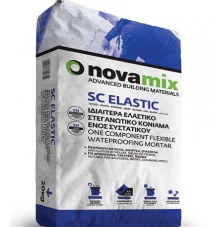 • Application should be made in two or more layers with a total thickness of at least 2 mm. Apply a first layer with a flat brush or roller on the properly prepared surface. Apply the second coat when the first one has hardened enough. For better thickness control, it is recommended to incorporate a suitable alkaline fiberglass mesh such as NOVAMIX FIBERGLASS NET on the first layer of the mortar while it is still fresh and smooth the surface with a metallic spatula. In any case the application should overlap the entire surface with a uniform thickness coat. In all critical areas, such as a floor joint with walls and vertical construction elements, the sealing zone must be reinforced by the use of a suitable fiberglass mesh. After application, SC ELASTIC should be left to cure in a relatively humid environment. Protect the fresh mortar from rain, frost and fast drying by suitable means.